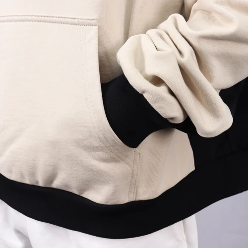 Dieser beige-schwarze Kapuzenpullover für Männer ist so cool. Zuerst hat er Farbblöcke. Beige und Schwarzblock, damit dieser Kapuzenpullover einen frischen Look zeigt. Er hat große Buchstaben auf der Rückseite in schwarzer Farbe für den Siebdruck, er sieht sehr deutlich aus. Für den Ellbogen Teilweise ist der Stoff für die Ärmel schwarz, das ist eine gute Wahl, weil er nicht so leicht schmutzig wird, sogar die Rippe ist schwarz. Das ist so schlau. Die Leute machen die Rippe immer leicht schmutzig, aber wenn wir schwarzen Stoff für die Rippe verwenden, Es ist nicht einfach, die schmutzigen Dinge zu finden.